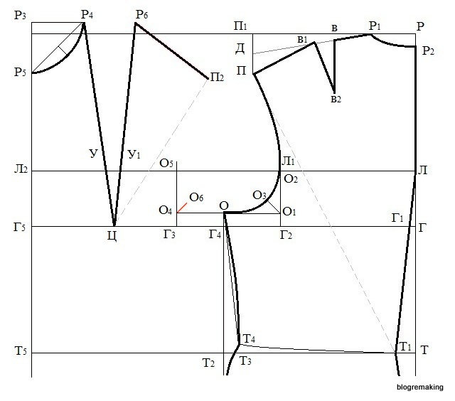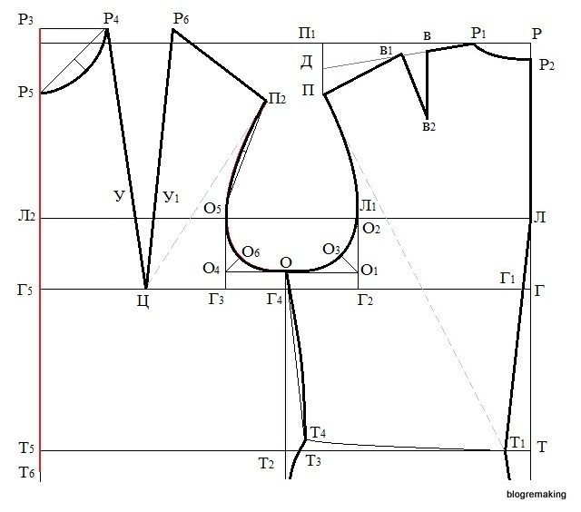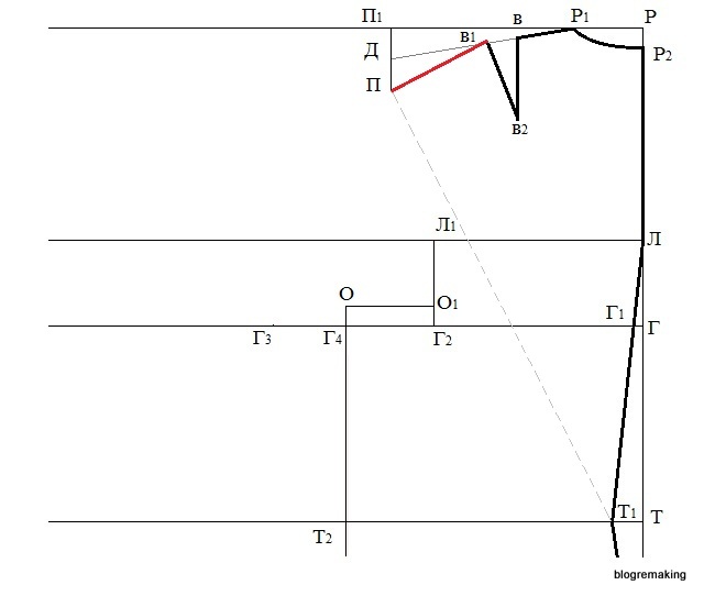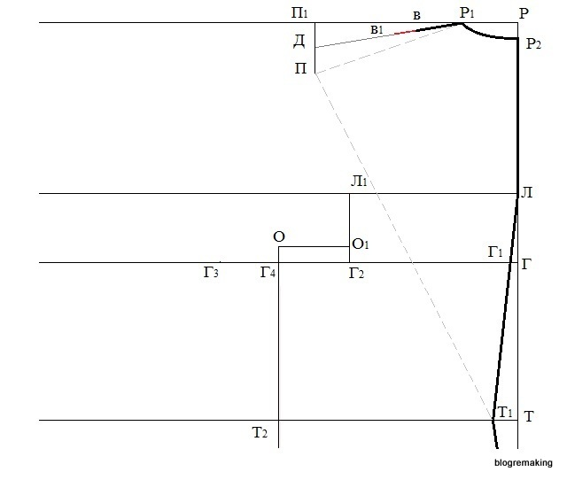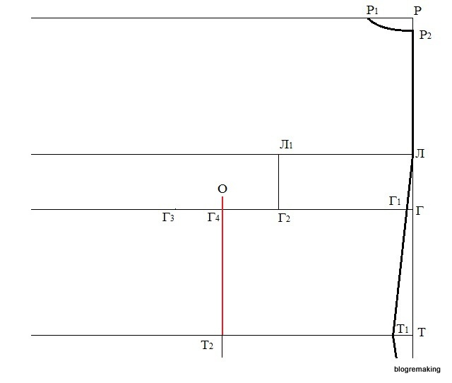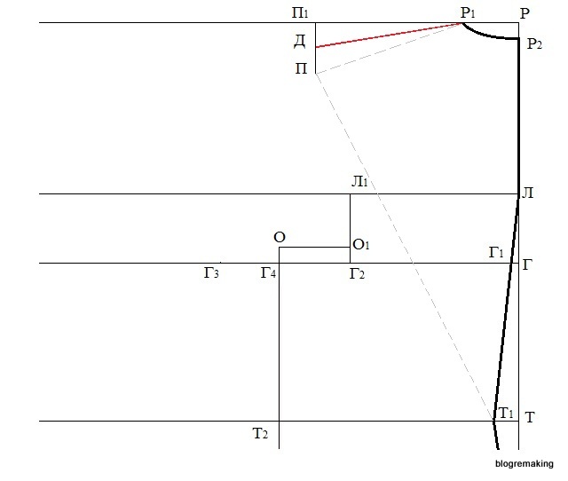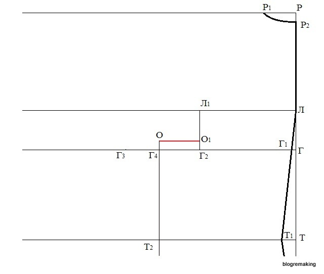 Оформим плавной прямой срез проймы полочки, соединяя точки П2, О5, О6 и О, при этом точки П2 и О5 сперва соединим тонкой линией, которую поделим пополам, а в точке деления восстановим перпендикуляр 0,5-1,5см и оформим вогнутый срез проймы.