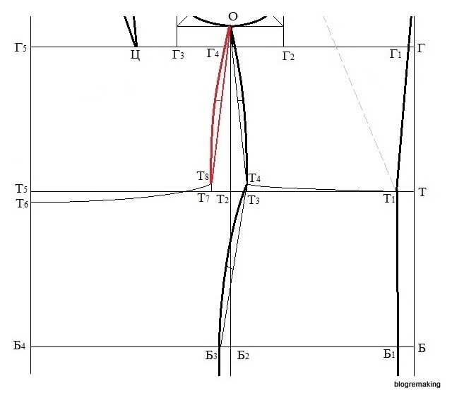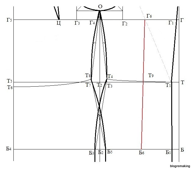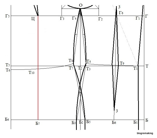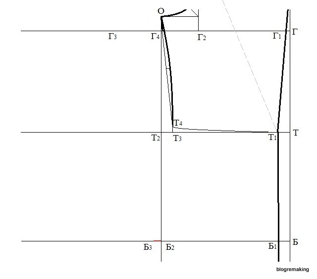 Примечание: Если разница между полуобхватами бедер и груди получилась отрицательной, то полученный результат делим пополам и откладываем эту величину вправо от точки Б2. Если разница равна нулю, то точка Б3 совпадает с точкой Б2.
