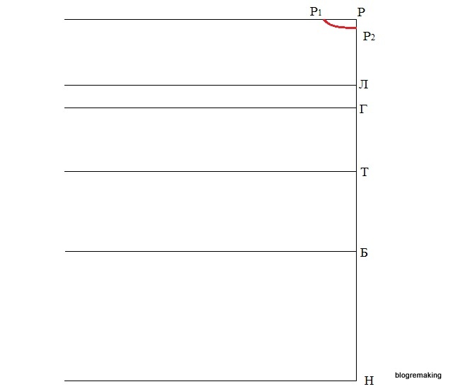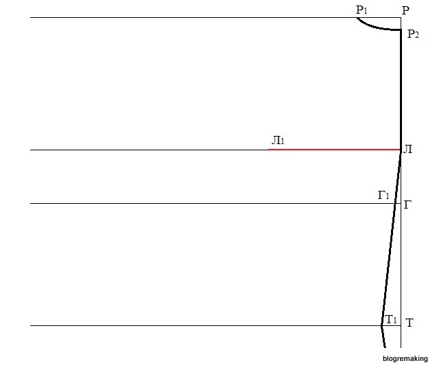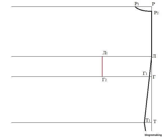 Высота груди. От точки Г5 вверх откладываем мерку высоты груди и получаем точку Р3 (Г5Р3=Вг=25см). Точку пересечения с линией лопаток обозначим Л2.