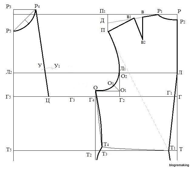 Срез проймы полочки. Вверх от точки Г3 проведем прямую, а из точки О влево проведем прямую до пересечения с вертикальной прямой из Г3, точку пересечения обозначим О4. От этой точки вверх отложим 1/2 ширину всей проймы минус 1см и поставим точку О5 (О4О5=1/2Г2Г3-1=10,7:2-1=4,4см).
