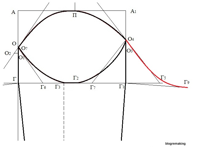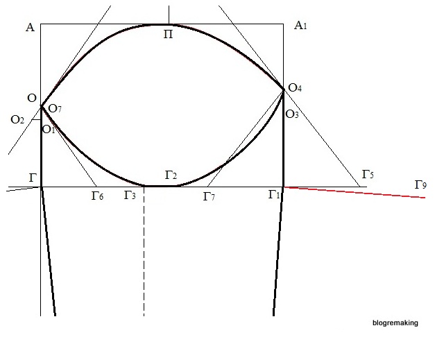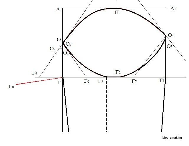 Окат рукава. Разделим отрезок АГ пополам и поставим точку О, от которой вниз отложим 2-2,5см и получим точку О1 (ОО1=2,5см).