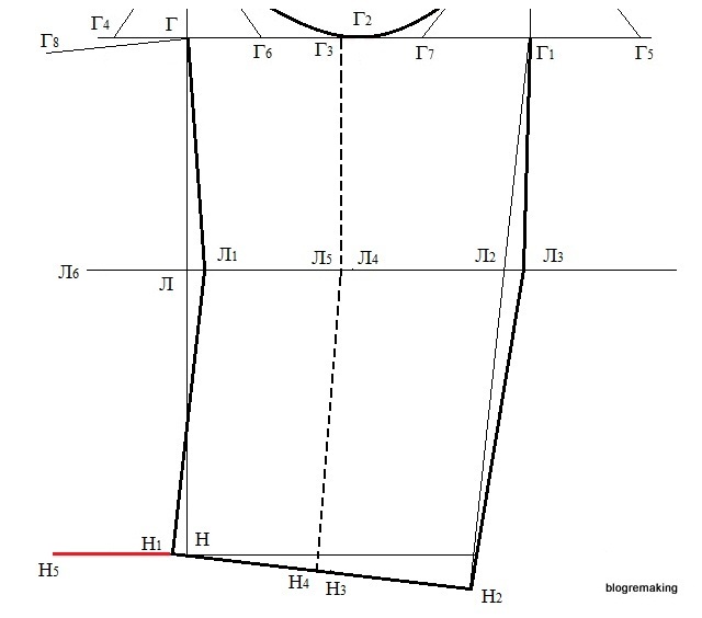 Линия середины полочки. Вниз от точки Г5 опустим перпендикуляр до линии низа, точку пересечения обозначим Н4, а точки пересечения с линиями талии и бедер обозначим точками Т5 и Б4.
