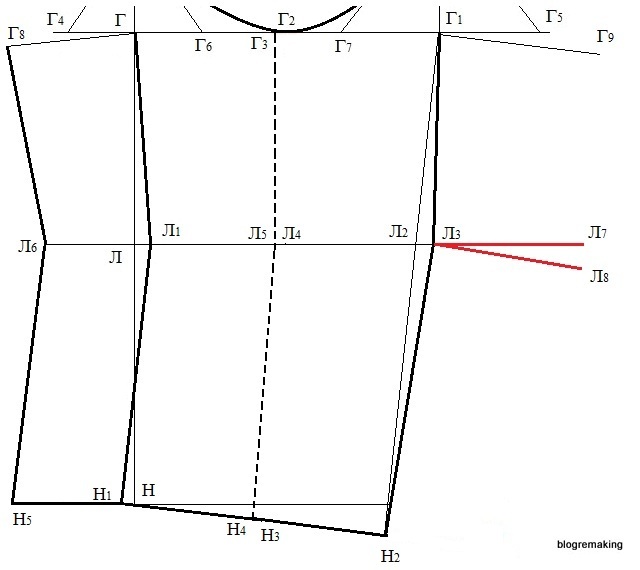 Соединим прямыми точки Г8, Л6 и Н5. Ломаная прямая Г8, Л6, Н5 - передний срез рукава.