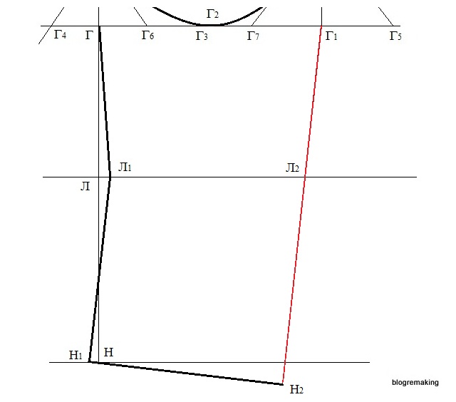 Задний перекат рукава. Соединим прямой точки Г1 и Н2, эта прямая пересечет линию локтя в точке Л2.